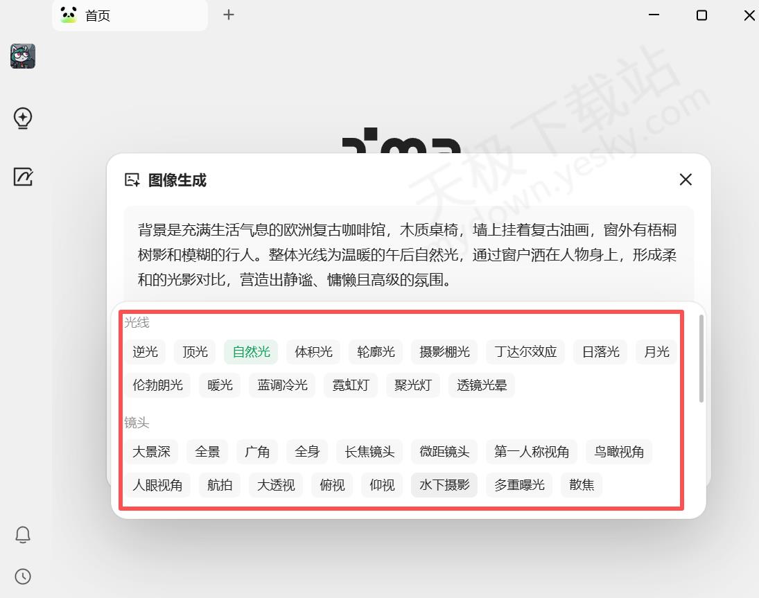 3.如果不知道提示语怎么写,可以简单写图像的主题内容,然后点击【提示词典】,选择光线和镜头,最后点击发送。