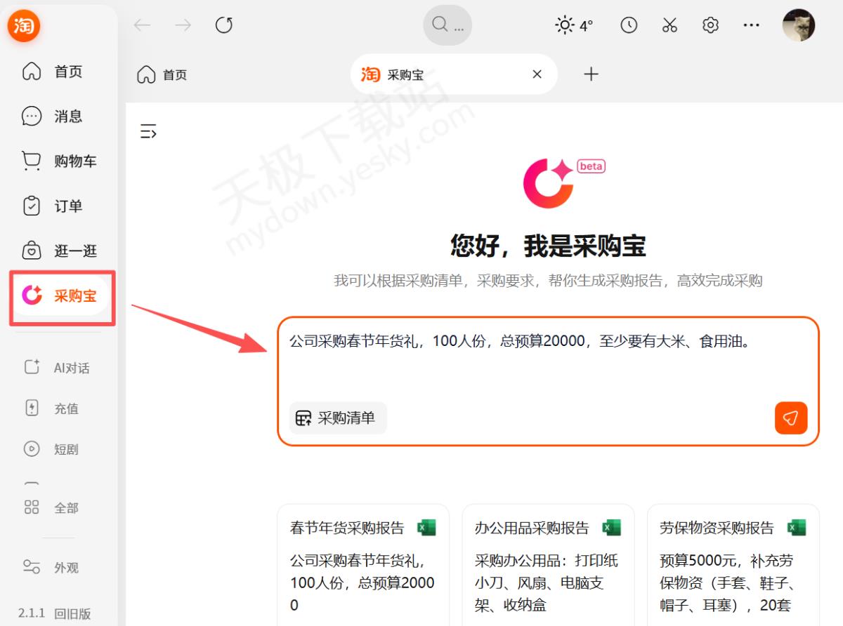 1.打开最新版本的淘宝客户端,点击桌面左侧的【采购宝】,在对话框中输入需要采购的物资、预算、人数、采购场景等信息,点击发送。