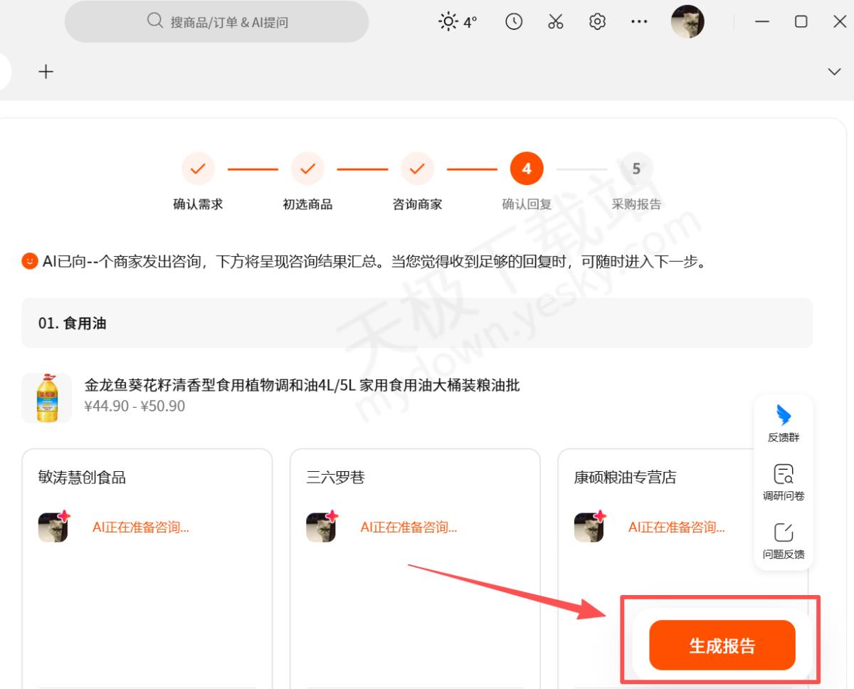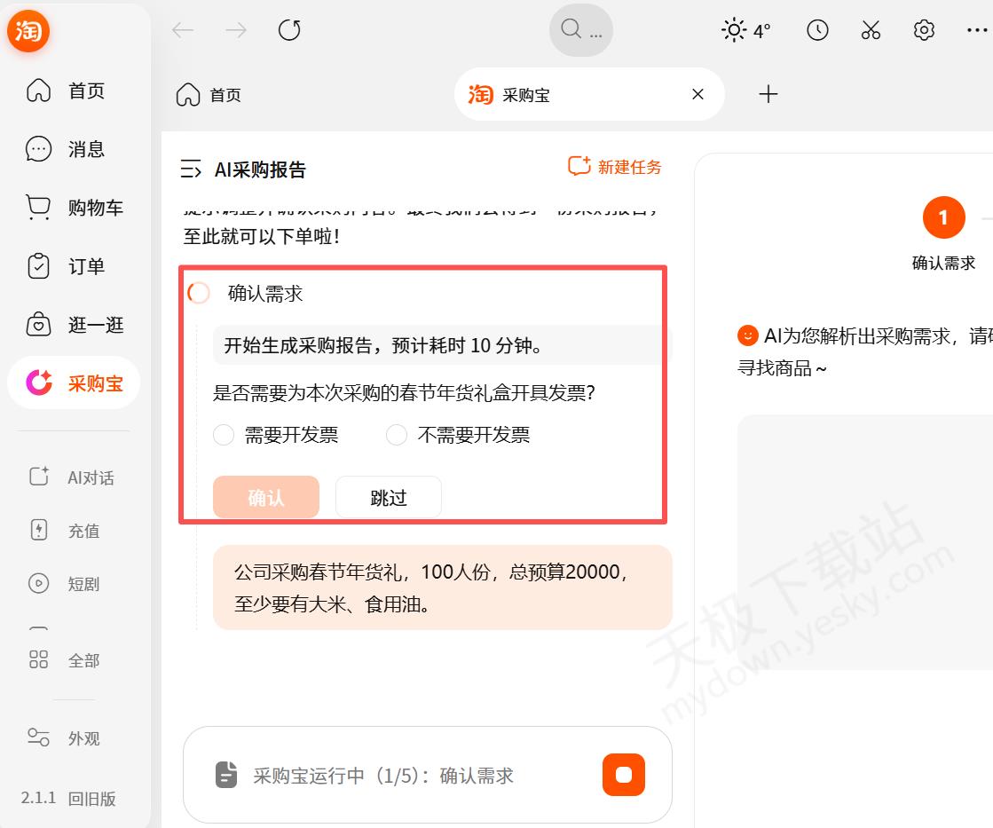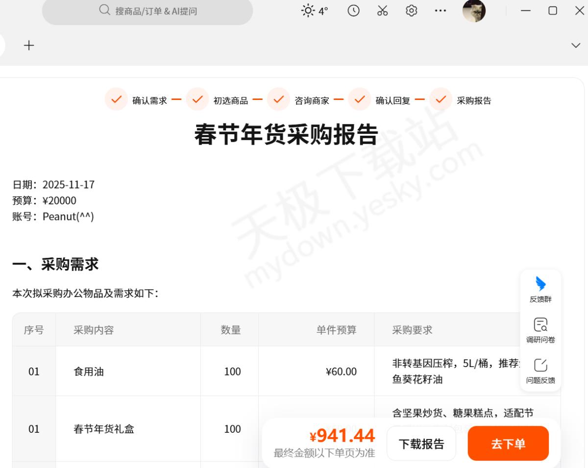 经过了解,淘宝桌面版采购宝是淘宝官方推出的AI工具,主要是为了满足用户的批量采购需求。它能帮你分析需求、筛选商品、批量咨询,还能把数据汇总。只要你提交物资类型、预算范围、使用场景等采购需求,它就能进行智能分析,生成专业的采购报告,帮助你快速下单。