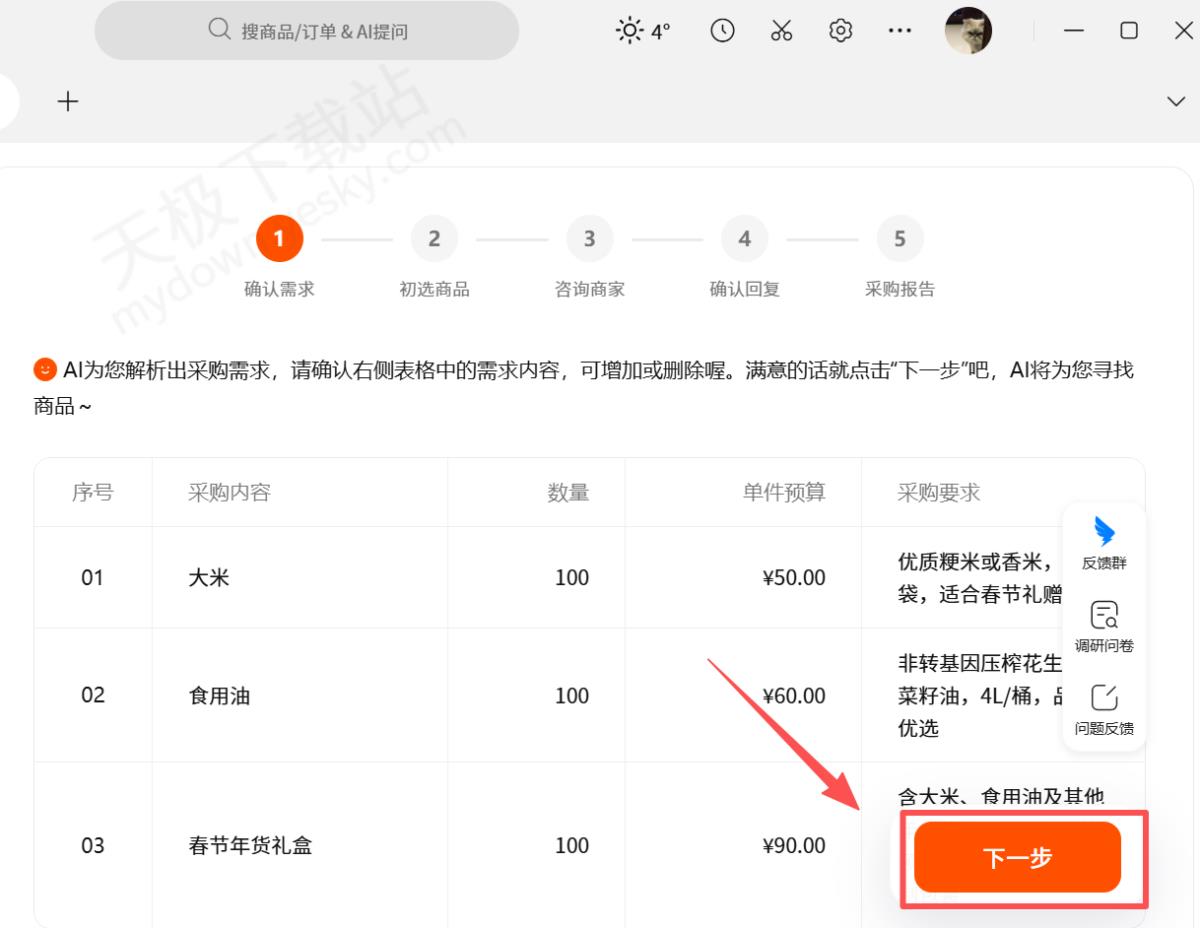 3.采购宝会初步筛选我们的需求,点击右下角【下一步】。