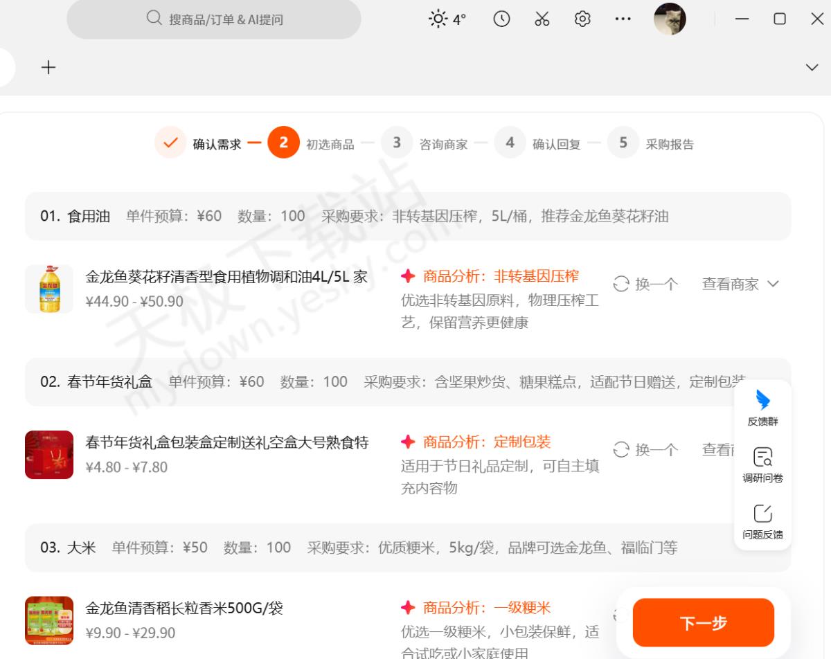 4.然后进入商品初选阶段,仔细查看每一个商品的价格、商家以及商品分析,确认无误后点击【下一步】。