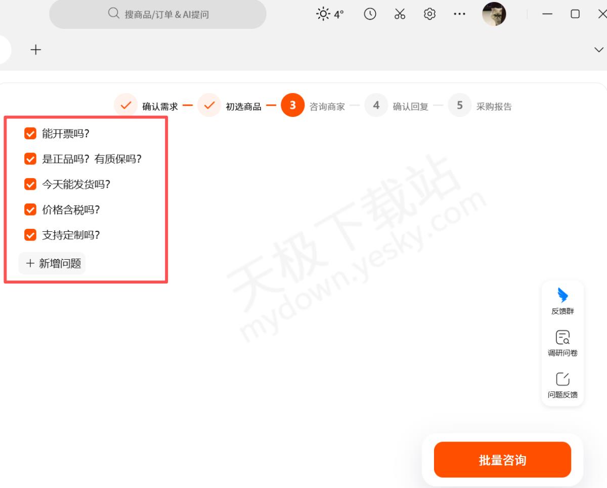 5.进入问题咨询阶段,可添加各种问题,在此处批量咨询卖家。