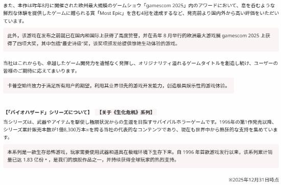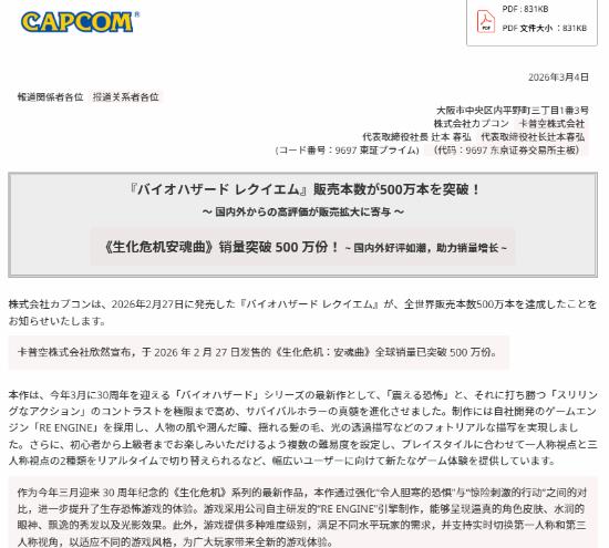 卡普空官网消息,《生化危机9:安魂曲》2月27日发售,截至3月4日,全球销量已达500万份。