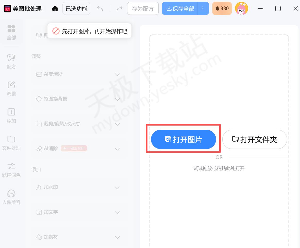 2.进入批处理页面,点击【打开图片】,上传图片。