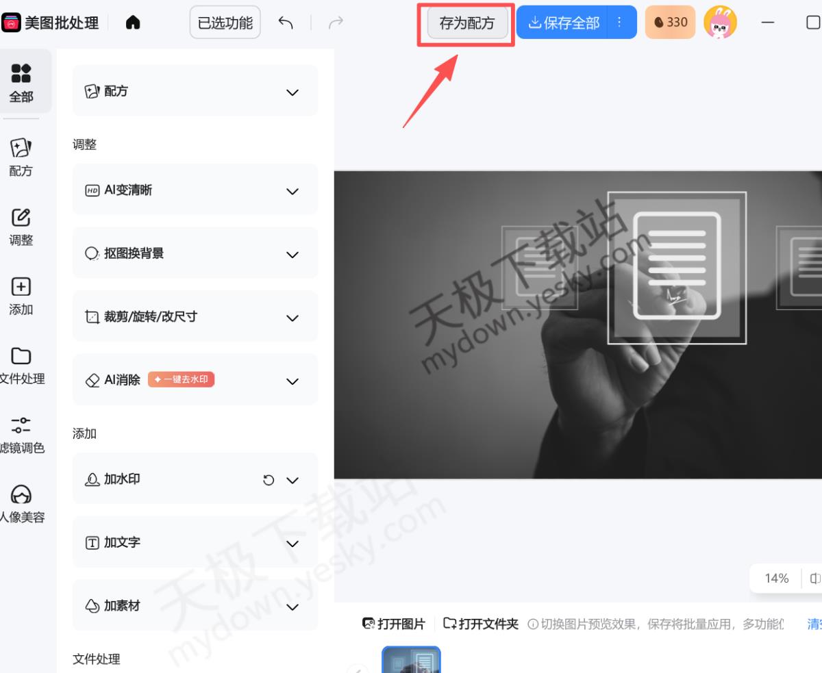 3.使用左侧的工具对图片进行预设编辑,然后点击上方【存为配方】。