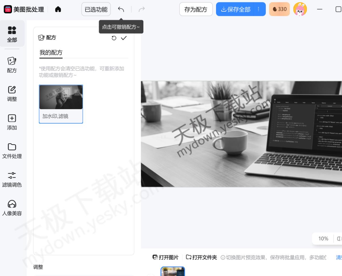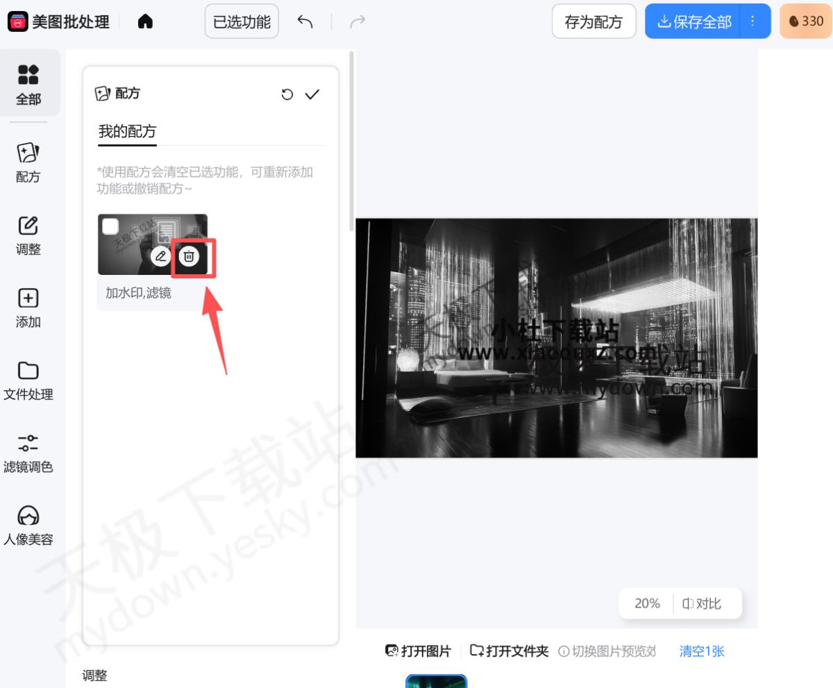 1.打开美图秀秀,点击【批处理】,打开图片,点击左上角配方,鼠标移动到需要删除的方案上方,点击【删除】选项。