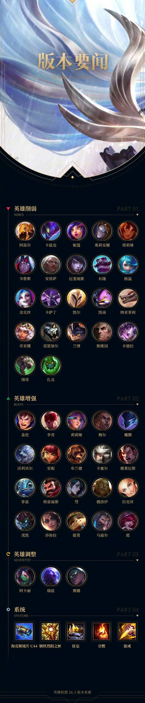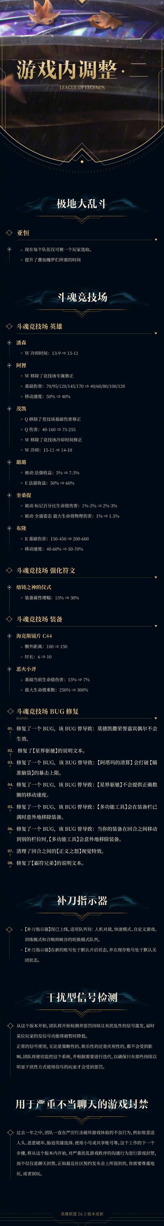 2026 年 3 月 4 日,《英雄联盟》官方发布 26.4 与 26.5 版本合并更新公告,游戏将于 3 月 5 日凌晨 1 点至 12 点开启全区停机维护,本次将一次性合并更新两个版本的全部内容。为保障排位赛整体体验,官方将在 3 月 4 日 0 点提前关闭排位赛入口,正在进行中的对局不会受到影响,所有在维护期间原本应结束的活动,实际结束时间将提前至维护启动时刻。