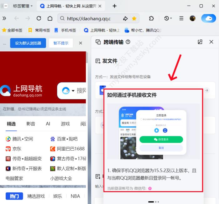 小编亲测,想在QQ浏览器上实现跨端传输,得确保电脑和手机都登录了同一个账号,另外QQ浏览器版本得是V15.5.2或更新才行。