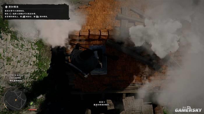 在游戏一开始,一个支线任务教学中,要求玩家爬上房顶帮人打扫烟囱。而进行打扫的交互判定点,必须要站在烟囱正上方,按住L1进行仔细的瞄准到相应的位置才能成功打扫。在这个任务过程中我围着烟囱上上下下绕了四五圈才明白到底要怎么打扫。