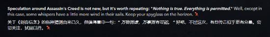 他这样写道:“围绕《刺客信条》的各种猜测早已不是什么新鲜事,不过那句老话依然值得重申:‘万物皆虚,万事皆允。’当然,至少在这一次,并非所有传闻都只是空穴来风——有些低语,确实已经乘上了顺风。把你的望远镜对准地平线吧。”