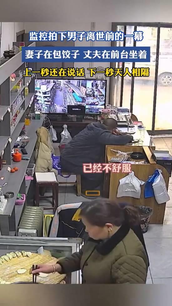 据媒体报道,画面中的一对夫妻正在自家店内聊天,妻子在一旁包着饺子,丈夫则坐在收银台前。上一秒两人还在聊天,下一秒丈夫便突发不适,身体出现异样。