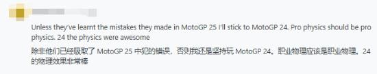 有的玩家认为,《摩托GP 25》的物理反馈令人失望,如果新作不能纠正前作的错误并回归《摩托GP 24》那种备受推崇的“职业级物理(Pro physics)”手感,他们将拒绝买单。