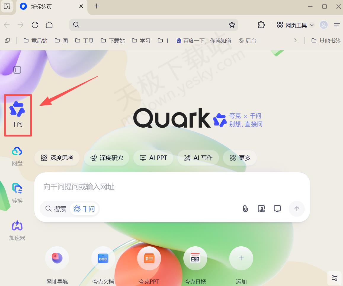 1.下载并打开最新版本的夸克浏览器,点击首页左侧【千问】选项。