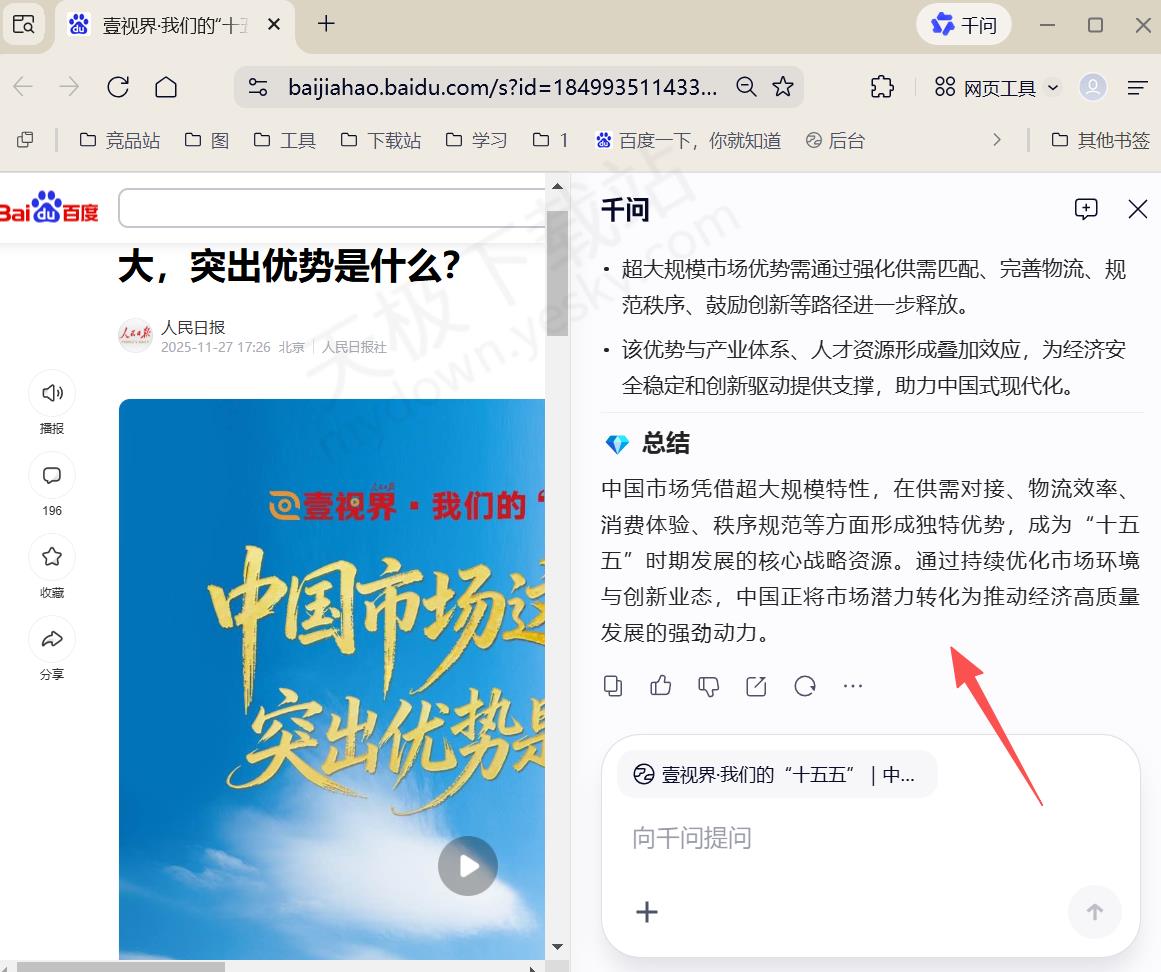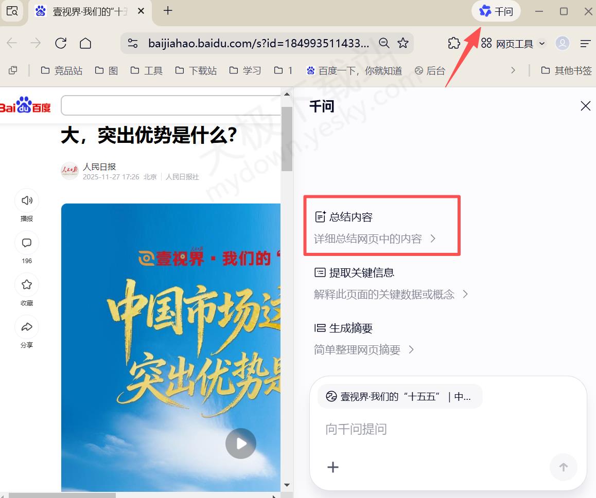 4.我们日常浏览网页时,右上角也会显示【千问助手】,点击可对网页进行总结。