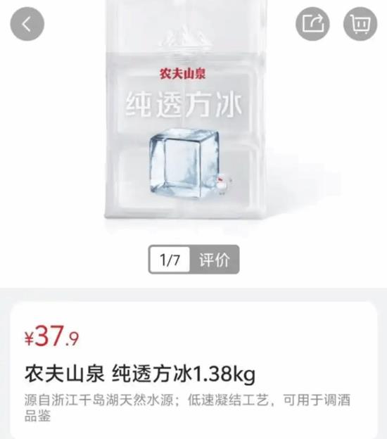 据悉,该款冰块产品名称为“农夫山泉纯透方冰”1.38kg,售价为37.9元,源自千岛湖天然水源,采用超低速凝结工艺,历经约42至48小时才得到纯透美观的方冰,不易融化,为专业品酒设计。消费者评价以好评居多,称这款方冰融化速度很慢,配酒水饮料正合适。