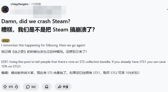 听说了吗,空洞骑士丝之歌刚把Steam搞崩没多久,现在杀戮尖塔2又来了,服务器又撑不住了。