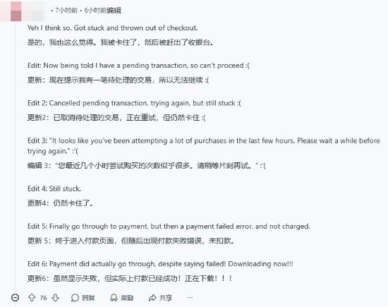 尽管游戏目前仍处于抢先体验阶段,其正式的完全体尚未发售,但依然受到了玩家们的热烈追捧。很快,就有玩家陆续反应在购买时遇到了商店页面卡顿、购买订单卡在处理中等问题。
