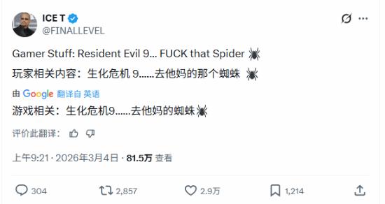 知名说唱歌手Ice-T最近在X上发了条推,风格很符合他本人,直接点名《生化危机9》里那只吓人的大蜘蛛BOSS。3号晚上他就写了句话:"……那蜘蛛真他妈该死。"