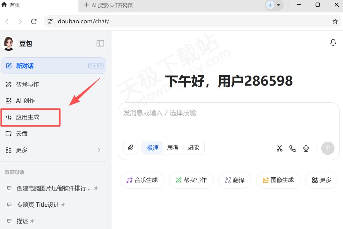 1.打开最新版本的豆包,点击左侧【应用生成】。