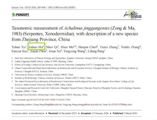 如今,括苍山脊蛇已被正式命名(学名:Achalinus mirabilis),其CO1基因与近缘物种的遗传差异达9.5%~10.9%。根据最外行背鳞明显起棱等特征,能与近缘物种明确区分。这一发现不仅丰富了浙江的物种多样性“家底”,更让胡家豪这位高三少年的故事,成为公民科学参与专业科研的生动范例。