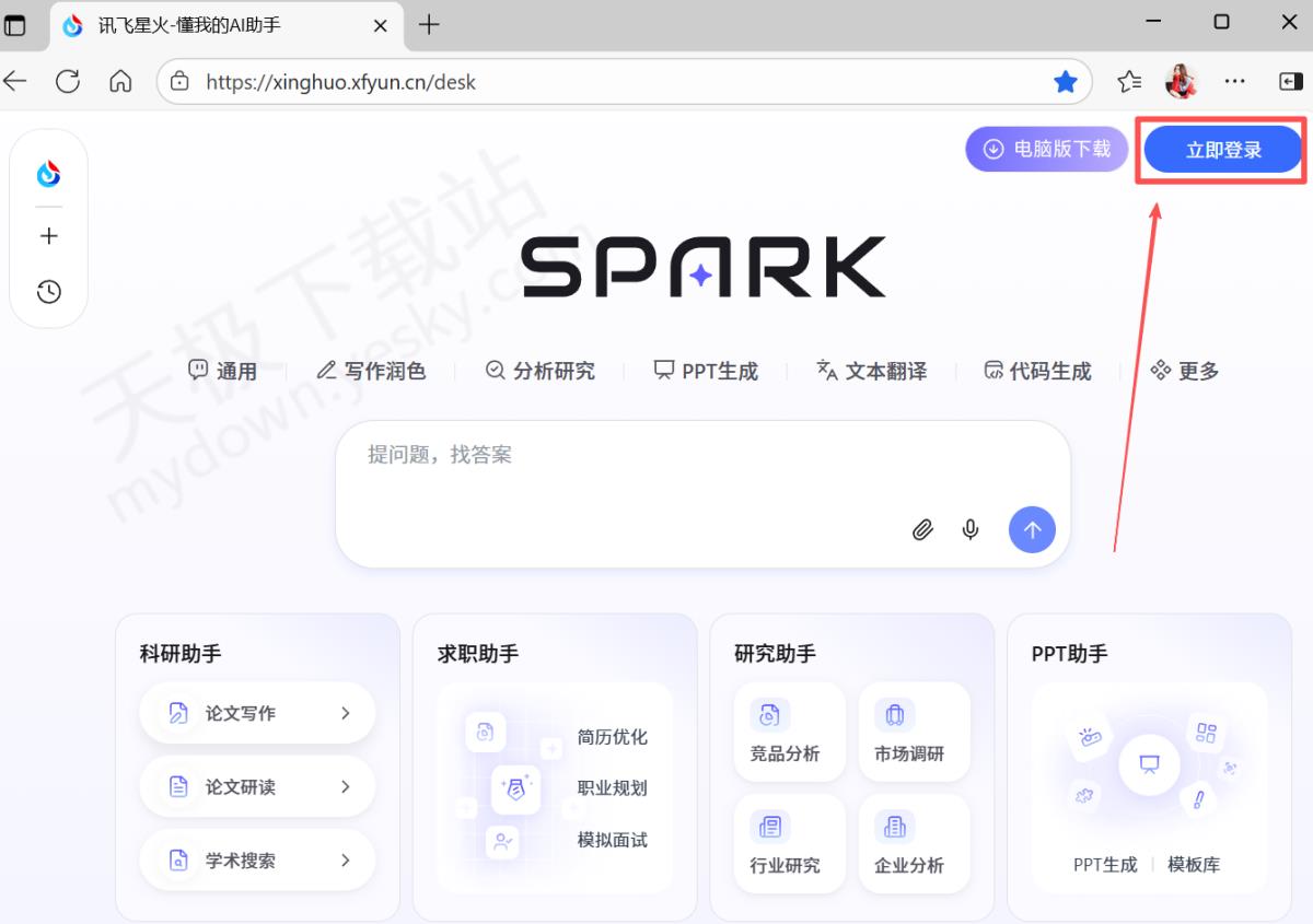 1.打开讯飞星火官方地址,点击右上角【登录】选项。
