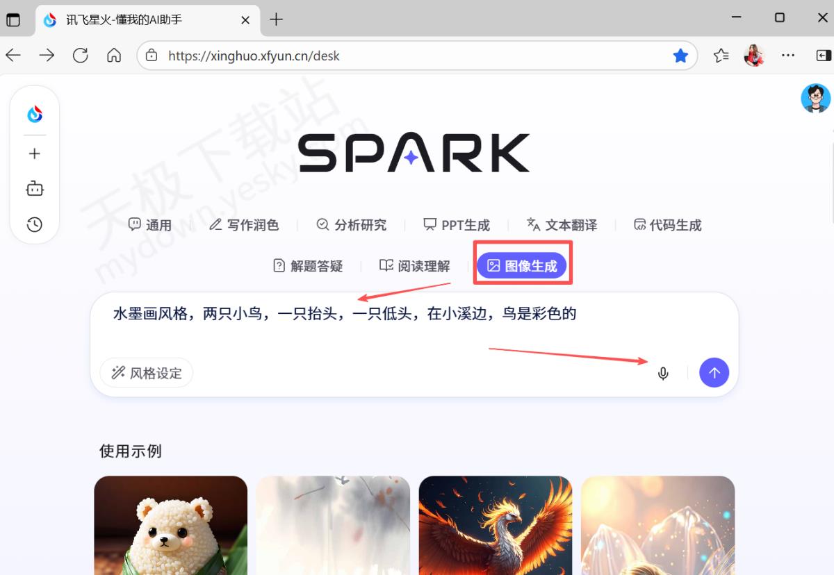 2.在这里可以找到AI图像生成工具,在下方输入图像的主题内容,如果不知道怎么写,可以点击【风格设定】,按照讯飞型号给的模板来填写。填写完毕后点击发送即可。