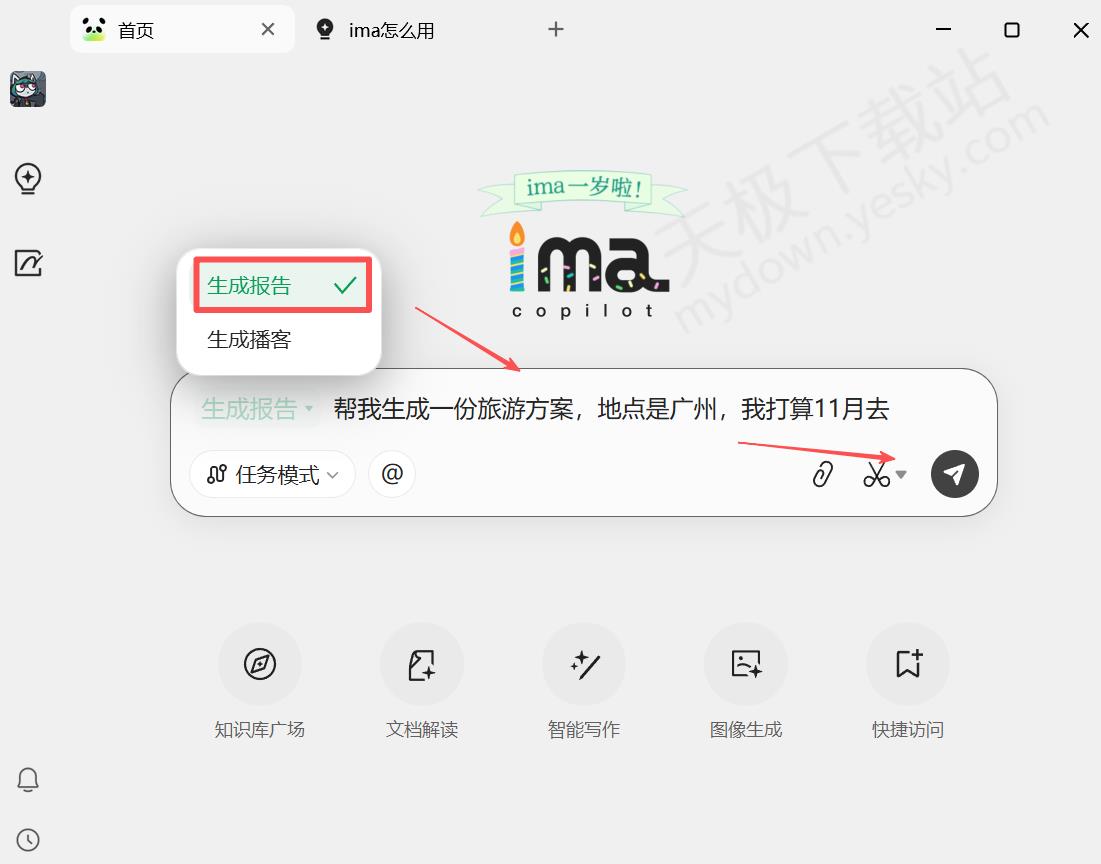 3.选择生成报告或播报,然后输入主题内容,点击发送。