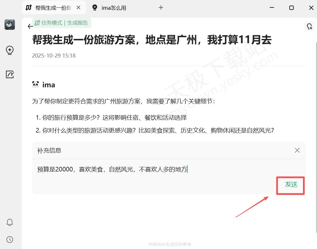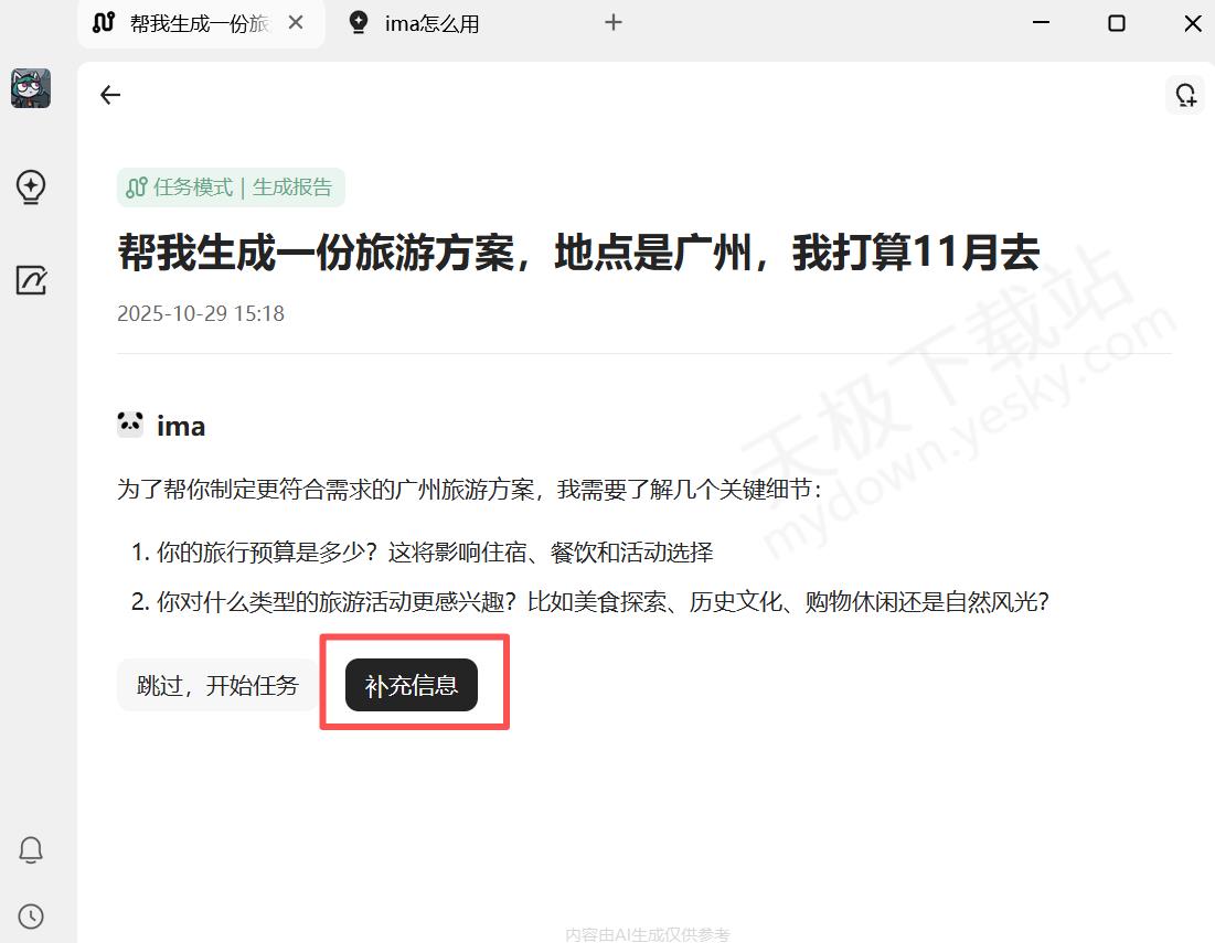 4.腾讯ima会读取主题,并询问关键信息,点击【补充信息】。