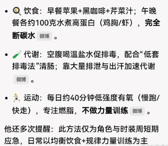 他在分享中反复强调,这套方法属于职业应急手段,仅适用于短期内需要快速消肿、减脂的特殊场景,并非健康日常减脂方案。因增重后身体出现炎症、腰腹赘肉堆积,他才采取极端方式快速调整,普通人切勿盲目效仿。