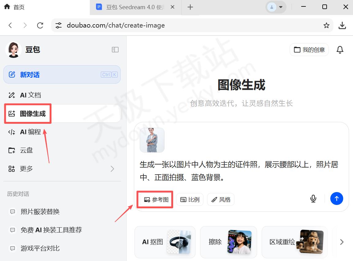 1.下载并打开豆包,点击左侧【图像生成】选项,然后在右侧点击【参考图】,上传人像照,输入提示语,最后点击发送。