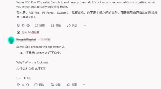 不少玩家表示,自己同时拥有PS5、PS Portal以及Switch 2,甚至还有PS5 Pro。在他们看来,游戏主机之间不是互相竞争的关系,只要是自己喜欢的设备和游戏,就可以放心去玩,没必要非要分出高低。还有玩家直接说,就算有其他主机,照样会给Switch 2买游戏,喜欢就够了,不需要多余理由。