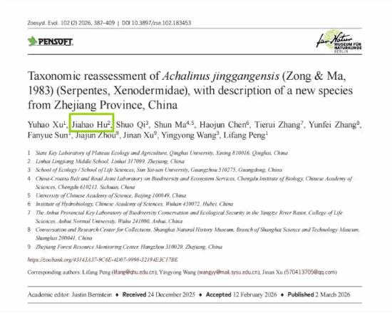 这是20世纪以来,首个模式产地位于浙江的爬行动物新物种。胡家豪在朋友圈晒出论文截图后,这段 “午夜寻蛇” 的经历引发关注。