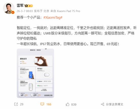 2026 年 3 月 7 日,小米集团创始人雷军在微博发文,正式推荐旗下新品智能定位器 XiaomiTag。这款主打 “一找就对” 的定位产品,凭借精准定位、隐私保护与长续航等特性,现已开启销售,售价 69 元起。