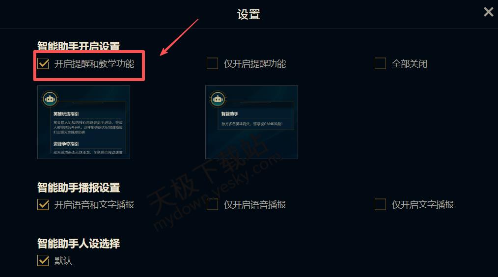 2.勾选最上方的【开启提醒和教学功能】,进入游戏后,语音助手就会开启语音播报啦。