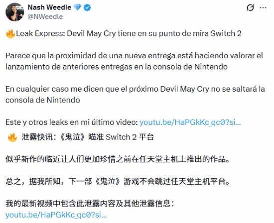 据任天堂知名爆料人Nash Weedle的消息,卡普空的经典动作游戏《鬼泣》系列新作(暂称《鬼泣6》)可能会首次登陆任天堂平台,预计会在Switch 2上发布。这将是《鬼泣》系列首次在任天堂硬件上首发的新作。
