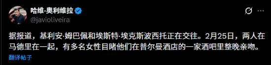 绯闻愈演愈烈之际,爱珀斯托本人恰好在社交媒体上发布了巴黎的最新照片,时间点上的巧合更让粉丝浮想联翩。多家体育媒体也证实,姆巴佩近日因伤缺阵,确实身在巴黎接受治疗。也就是说,两人确实在同一时间段出现在巴黎。