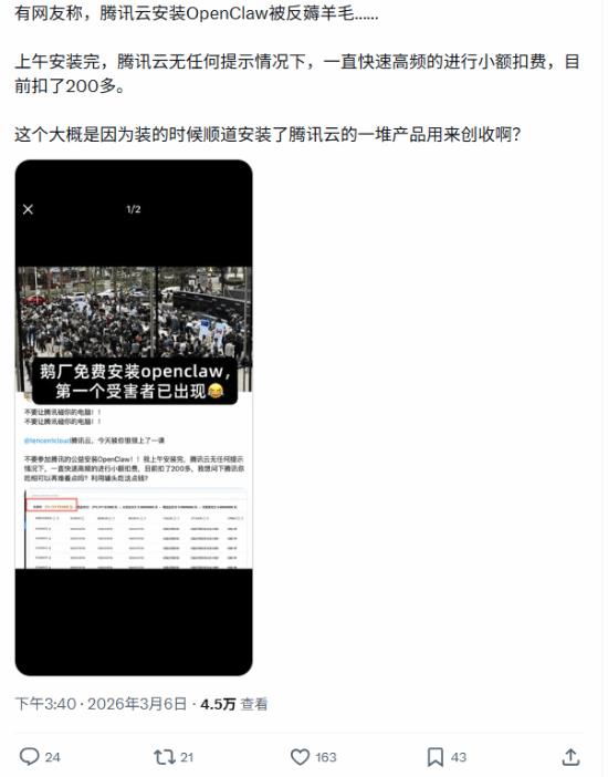 有网友表示,自己想薅腾讯羊毛被反薅羊毛,安装完后腾讯云在无任何提示情况下,一直快速高频的进行小额扣费,目前扣了200多。腾讯官方回应:相关费用为历史使用产生。