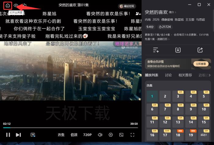 腾讯视频打开单窗口模式后,可以通过视频播页面左上角的【主页】按键,返回主页。