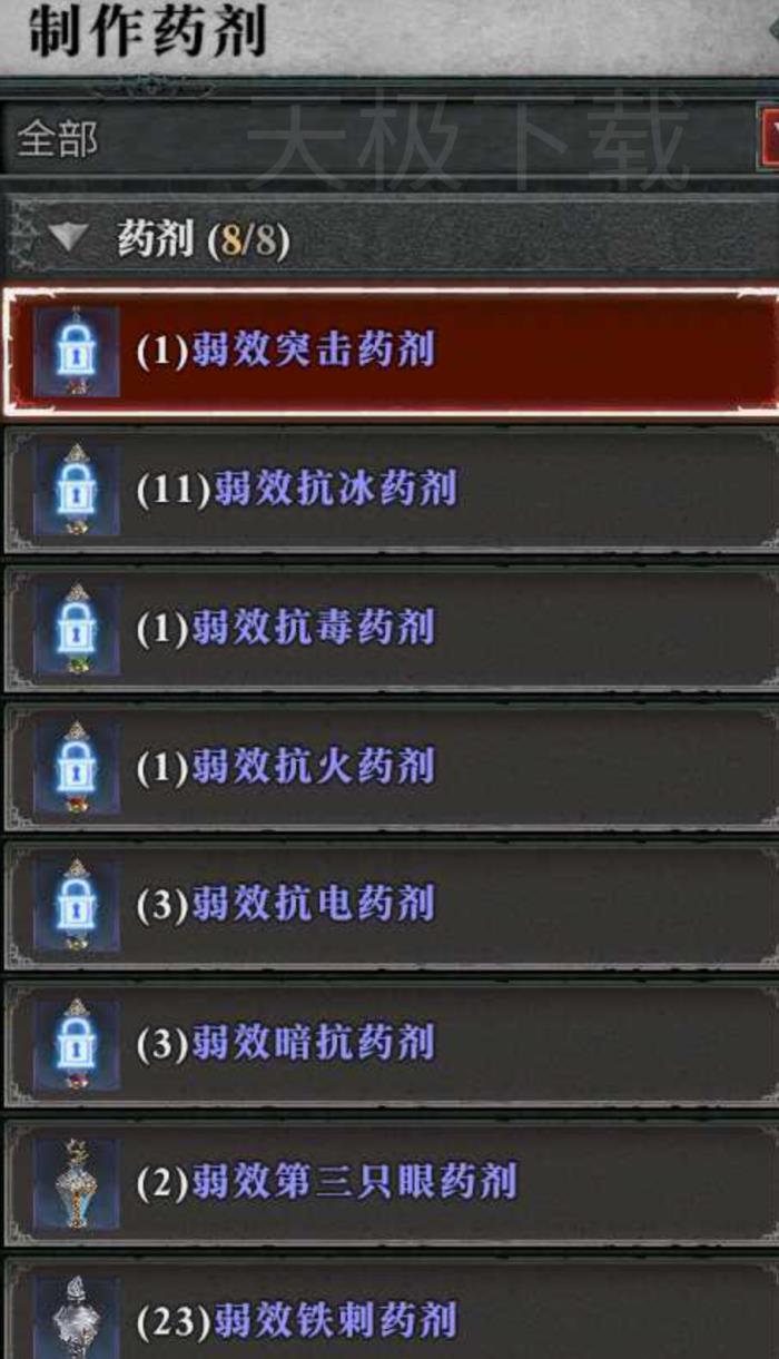 ●制作灵药,包括核心属性增强(力量、敏捷、智力、意志)、防御强化(护甲、荆棘、抗性)、进攻增益(攻击速度、暴击率、幸运一击)和特殊效果(经验加成、怪物掉落提升)等多种类型,每种灵药提供对应属性加成并持续一段时间,助力应对不同战斗场景。