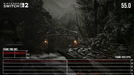 反观《生化危机:村庄》,其对 Switch 2 的硬件配置形成了更大的压力,尽管该作的分辨率设定与《生化危机 7》完全一致,主机模式 720p、掌机模式 432p,且均通过 DLSS 超分至 1080p,但游戏内城堡、村庄、大型开放空间等复杂的场景设计,让其难以维持稳定的高性能表现。画面方面,Switch 2 版《生化危机:村庄》虽仍优于 PS4 版,要知道 PS4 版即便拥有 900p 原生分辨率,也因低效的 TAA 抗锯齿拖累了画质,但该版本还是出现了专属的画面问题,比如受分辨率缩放影响,雪花特效几乎难以分辨,雾气效果的渲染浓度也远高于其他平台,背后具体原因尚未明确。性能上的问题则更为突出,该作不仅全程无法稳定达到 60 帧,甚至很少能触及这一帧率,在硬件负载较高的场景中帧率会出现明显下跌,水库区域的帧率甚至低至约 40 帧,而掌机模式下,即便借助 VRR 显示屏的动态刷新率功能,也无法完全掩盖帧率的波动问题,游玩体验进一步打折扣。