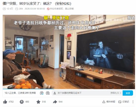 最近,B站的UP主“骨灰级游戏玩家_杨老头”上传了一段他挑战《生化危机9》的视频,90岁的杨老头面对突然扑来的僵尸,依然淡定自若,完全不被吓到。