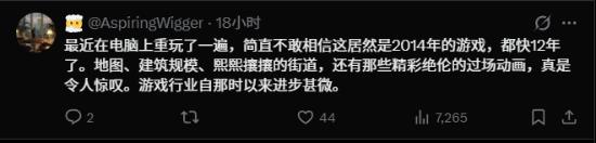 还有玩家在重玩后感慨:我很难相信这是2014年的游戏。地图规模、建筑高度、繁忙的街道以及电影级过场都令人惊叹。自那以后游戏行业在某些方面的进步其实并没有想象中那么大。