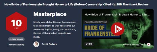 与此同时,IGN回顾了1935年上映、同样改编自《科学怪人》的经典电影《科学怪人的新娘》,给出了满分。