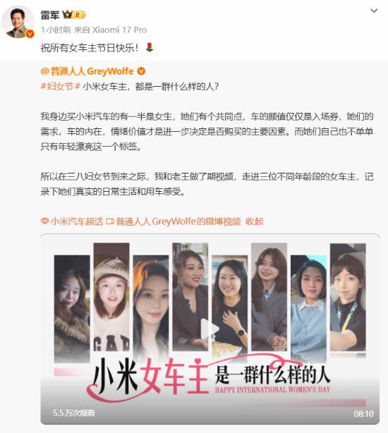 对此,雷军转发视频称:“祝所有女车主节日快乐!”