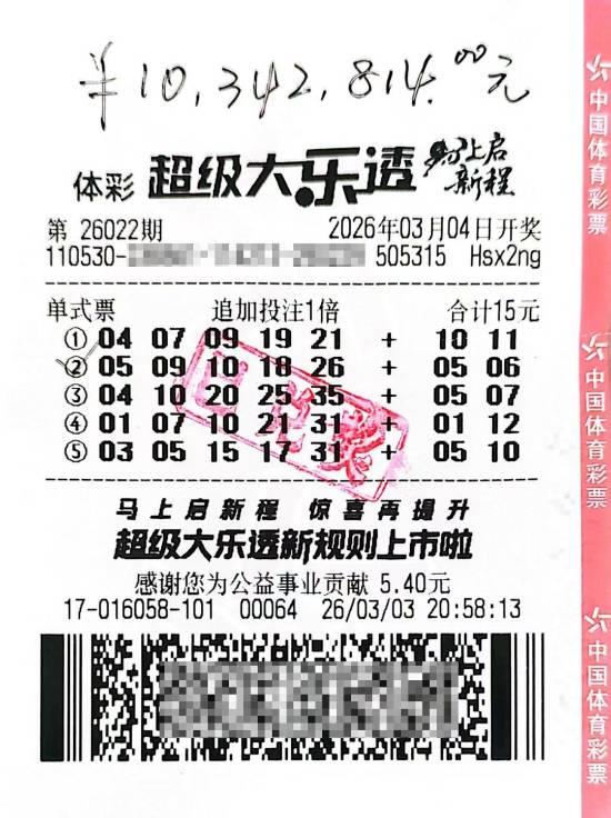 该期超级大乐透于2026年3月4日开奖,周先生的中奖信息于3月6日确认,中奖奖金具体为10342814元。