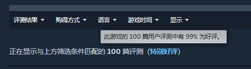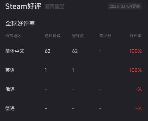 目前游戏共有100条评价,好评率高达99%。其中,简体中文玩家贡献了62条评价(数据略有延迟),好评率更是达到了100%。