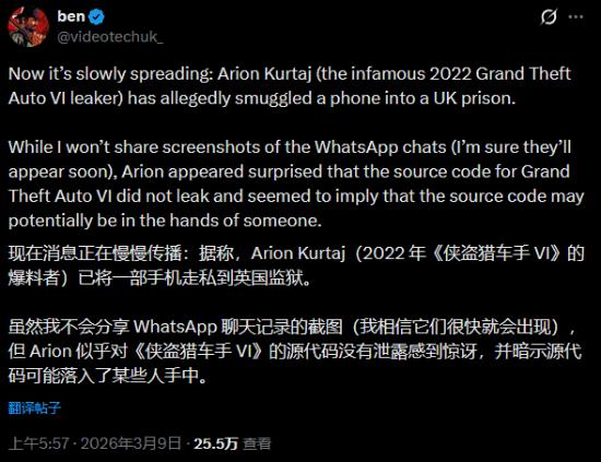 近日,据Rockstar资讯博主@videotechuk_报道,Arion Kurtaj已将一部手机走私到英国监狱,并且据介绍,Arion Kurtaj似乎对《GTA6》的源代码至今都没有泄露感到惊讶,而且他似乎暗示,《GTA6》的源代码目前仍掌握在某人手中。