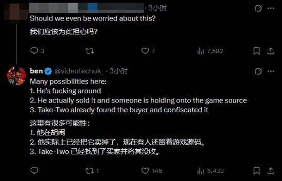 关于《GTA6》源代码的部分,@videotechuk_分析认为有三种可能性:第一是Arion Kurtaj在胡说;第二是Arion Kurtaj把源代码出手给其他人了,而这个人目前还留着没有公布;第三种可能性是Take-Two找到了买家并将其没收。