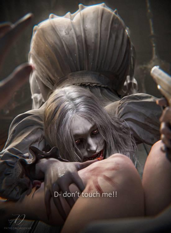 这张作品采用第一人称视角,仿佛玩家正躺在地上或被压制住,从自己的视角看到一名恐怖女性正俯身打算啃咬腿部。
