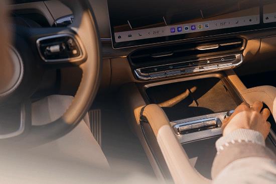 新车豪华感营造相当到位,除了大面积的真皮外,还使用了实木、金属、水晶进行点缀装饰,T型台扶手区域设置了和卡宴、奔驰GLE同款的双扶手,这在新能源SUV上确实比较少见。